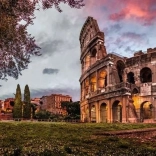 Genießen Sie einen wirklich schönen Panoramablick auf das Kolosseum beim Sonnenuntergang mit allen Details, die dem Bild eine atemberaubende Realität verleihen.