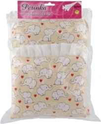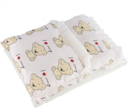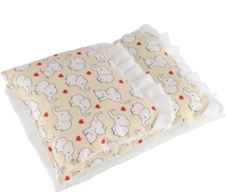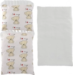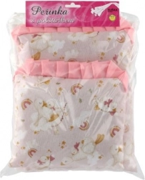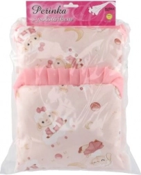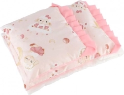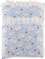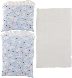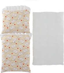 Kissen 23 × 28 cm, Unterlage 50 × 30 cm, Bettdecke 35 × 28 cm – passen hervorragend in Puppenwagen und Puppenbettchen.