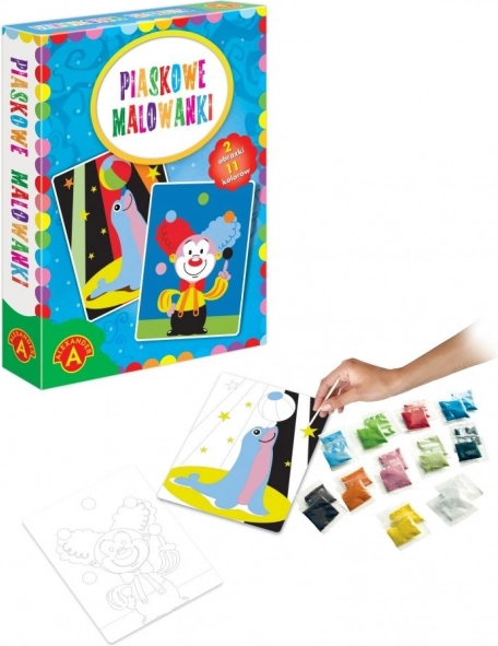 Beliebtes künstlerisches Kinderspiel mit Sandmalerei, bei dem nach und nach die einzelnen vorgeschnittenen Bildteile freigelegt werden, um die klebrige Oberfläche sichtbar zu machen. Die freigelegten Elemente werden mit Sand bestreut – entweder in der Farbe der Vorlage oder nach eigener Fantasie – und es entsteht eine schöne Illustration.
