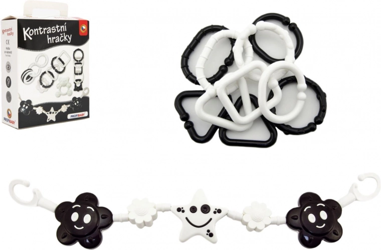 Kontrast-Set Spielzeug für Babys – Rasseln, Beißring und Hängekette für den Kinderwagen