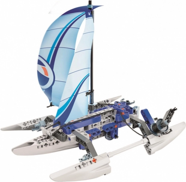 Baussatz zur Herstellung von 10 Bootsmodellen, die wirklich schwimmen. Das Hauptmodell, ein Trimaran, ist mit verstellbarem Ruder und Segeln ausgestattet.