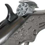 Dieses stylische Unterhebelgewehr kombiniert einen Metallkorpus mit einem „holzfarbenen“ Schaft und trägt reichhaltige dekorative Gravuren. Dank der stabilen Metallkonstruktion ist es ideal für häufiges Spielen und passt perfekt zu kindlichen Western-Abenteuern. Die orangefarbene Mündungskappe signalisiert deutlich, dass es sich um ein Spielzeug handelt.