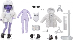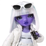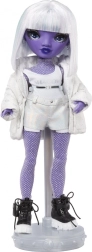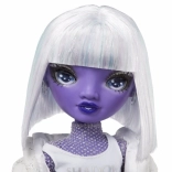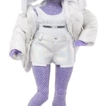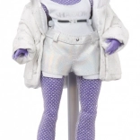 Die Puppe ist mit einem modernen, lila Erscheinungsbild und Accessoires verziert, die ihren einzigartigen Stil betonen.