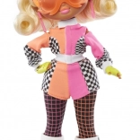 Die Puppe ist in einem bunten und stilvollen Outfit mit Karomustern gekleidet, was ihre Einzigartigkeit und ihren Sammlerwert betont.