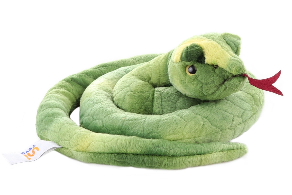 Diese grüne Plüschschlange schenkt Kindern sanfte Umarmungen und jede Menge Fantasie. Sie ist angenehm weich, für Babys sicher und liegt dank ihrer Maße gut in kleinen Händen. Realistische Details wie die rote, gespaltene Zunge und die feine „Schuppen“-Textur machen sie zum Lieblingsbegleiter fürs Bettchen und den Kinderwagen.