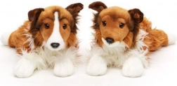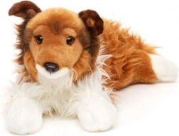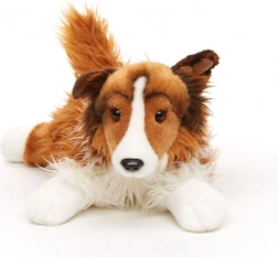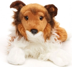 Dieses Plüschtier imitiert durch aufwendige Details in den Farben Braun und Weiß getreu einen Shetland-Schäferhund.