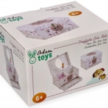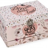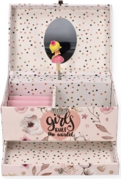 Dieses zarte rosa Schmuckkästchen mit Blumen- und Punktmuster birgt alles, was kleine Damen lieben: Beim Öffnen des Deckels erklingt eine Melodie und die Ballerina dreht sich auf der Spindel vor dem ovalen Spiegel. Innen erwartet Sie ein praktisch unterteilter Raum mit Ringkissen und Fächern für kleine Schätze.