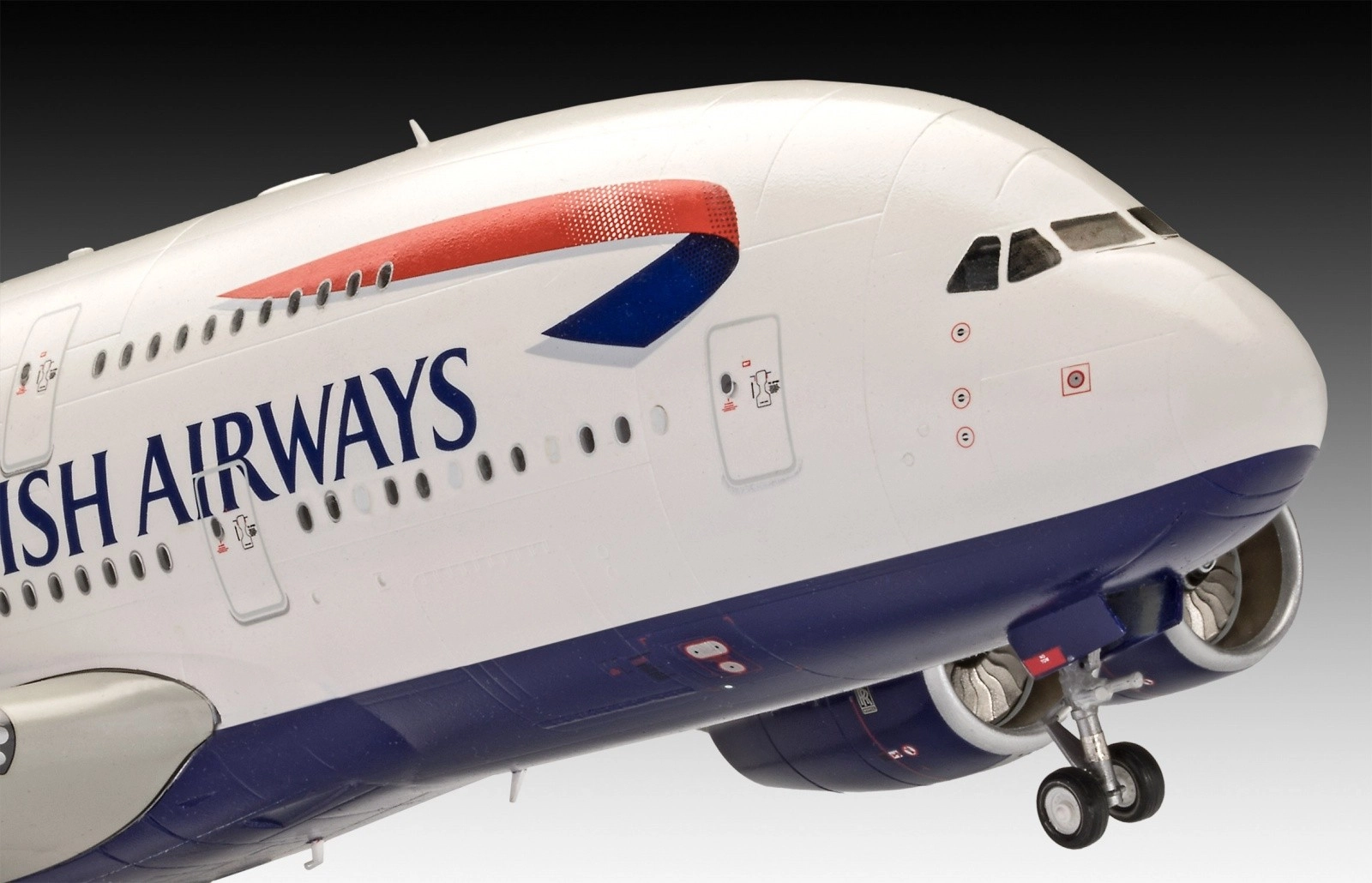 Das Plastikmodell des zweistöckigen, breitrumpfigen Langstreckenflugzeugs AIRBUS A380-800 in der klassischen Lackierung von BRITISH AIRWAYS begeistert jeden Fan der zivilen Luftfahrt. Die Teile sind passgenau ausgeführt und für einen sauberen Bau vorbereitet, das Ergebnis ist ein beeindruckendes Modell des legendären Verkehrsflugzeugs.