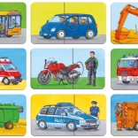 Dieses Set enthält 9 einzelne Puzzles mit jeweils 2 Teilen – mit Motiven wie Feuerwehr, Müllabfuhr, Bagger, Mähdrescher, Bus oder Motorrad. Durch die geringe Teilezahl ist das Puzzeln ideal für den Einstieg und unterstützt die richtige Entwicklung wichtiger Fähigkeiten.
