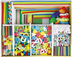 • Reichhaltiger Inhalt: transparente Folie und Papier, Wellpappe, Filz, Fleece, Schaumteile, selbstklebende Steinchen, Wäscheklammern, Holzstäbchen, Federn, Kreppband, Knöpfe und mehr.