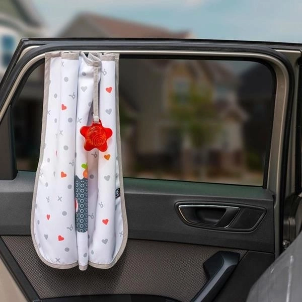 Die Installation ist dank der vier starken Magnete sehr einfach. Sie befestigen den Sonnenschutz schnell und sicher am Türrahmen – ganz ohne Saugnäpfe oder Haken. Wenn der Sonnenschutz nicht benötigt wird, kann er mithilfe der eingenähten Riemen leicht zusammengefaltet und fixiert werden, um ihn platzsparend zu verstauen. Der spezielle Stern mit schillerndem Effekt bietet zusätzlich Unterhaltung für kleine Reisende, sodass die Fahrt schneller vergeht.