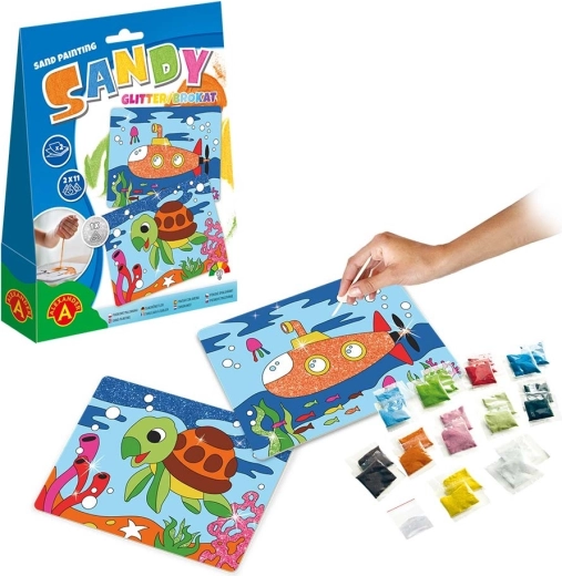 Dieses Kreativset bietet eine einfache und unterhaltsame Möglichkeit, lebendige und glänzende Bilder zu gestalten. Vorgefertigte Schablonen mit Klebeflächen ermöglichen es Kindern, einzelne Bereiche nach und nach freizulegen und mit farbigem Sand zu bestreuen. Durch das Hinzufügen von Glitzer erhalten die fertigen Motive einen einzigartigen funkelnden Effekt, der Kinder und Erwachsene begeistert.