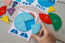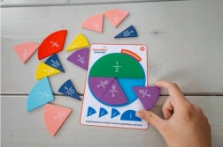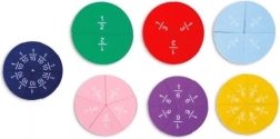 Das Set enthält Holzelemente, die die Brüche 1/2, 1/3, 1/4, 1/5, 1/6, 1/8, 1/10 veranschaulichen; das Set wird durch passende Arbeitskarten ergänzt.