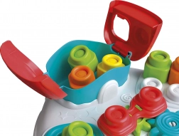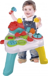 Der Tisch bietet eine breite Palette von Aktivitäten zur Förderung der kindlichen motorischen Fähigkeiten, wie Zahnräder, Bauklotz-Katapult und sprudelnde Blasen.
