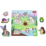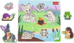 Die Holzsteckpuzzle Tiere auf der Wiese ist für kleine Kinderhände konzipiert. Fünf robuste Teile mit Holzknöpfen lassen sich bequem greifen und in die gefrästen Formen der Einlage einsetzen. Jedes Fach verfügt über eine passende schwarz‑weiße Illustration, die den Kindern zeigt, wohin das Teil gehört.