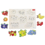 Das Holzpuzzle mit Obstmotiv ist eine großartige Wahl für das erste Puzzle. Farbige Illustrationen begeistern Kinder auf den ersten Blick und die Holzknöpfe erleichtern die Handhabung für kleine Entdecker. Die Grundplatte mit schwarz-weißem Umriss der einzelnen Formen zeigt, wohin welches Teil gehört, und unterstützt so Selbstständigkeit und Selbstvertrauen beim Spielen.