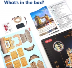 Entdecken Sie die Schönheit der Londoner Tower Bridge mit dem 3D-Puzzle-Bausatz von CubicFun. Dieses Modell aus der Serie Architecture Model-LED Lighting besteht aus einem speziellen Material - Schaumstoff, der mit bedrucktem, laminiertem Papier einer Dicke von ca. 3 mm beschichtet ist. Vorteile dieses Modells: