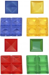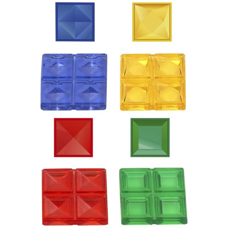 - 1 Spielbrett mit Raster, 4 Sätze mit je 21 Teilen (Gelb, Rot, Blau, Grün)