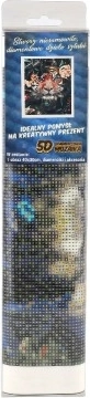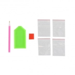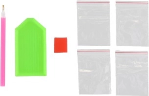 Im Set finden Sie eine Leinwand mit vorgedrucktem Bild, einen Stift zur Anwendung der Steinchen, eine Schale für die Steinchen, Wachs und ein Set bunter Steinchen.