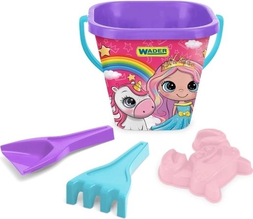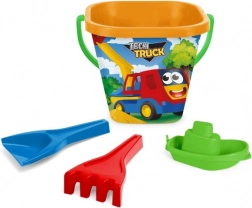 Quadratischer 2‑Liter-Eimer mit kratzfester und farbbeständiger Grafik – widersteht Sonne und Wasser und ist bereit für tägliche Sandabenteuer.