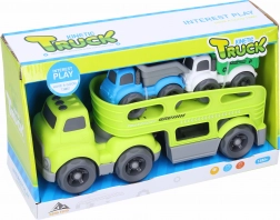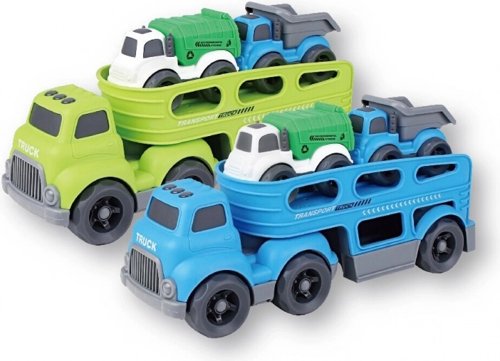 Suchen Sie eine einfache und effiziente Möglichkeit, kleine Autos zu transportieren? Dieser robuste Transporter macht es möglich! Er misst 30 cm und bietet genügend Platz für bis zu drei kleine Autos, die im Set enthalten sind. Der Transporter ist in den Varianten blau und grün erhältlich, sodass für jeden etwas dabei ist.
