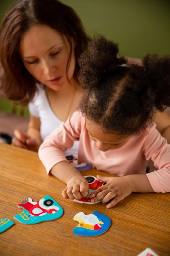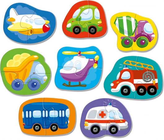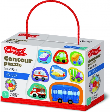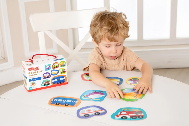Entdecken Sie die Welt der Verkehrsmittel mit Konturpuzzles, die speziell für kleine Kinder entwickelt wurden. Jedes der 8 Bilder besteht nur aus zwei stabilen Teilen, was die ersten Schritte beim Puzzeln erleichtert und das Selbstvertrauen kleiner Spieler stärkt. Dank kontrastreicher Formen und klarer Motive verstehen Kinder das Zuordnungsprinzip schnell.