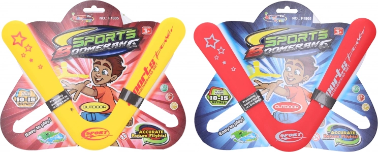 Kinder-Bumerang 27 × 20 cm mit ausgezeichneter Aerodynamik. Lässt sich leicht werfen, sicher fangen und kehrt bei richtigem Wurf zurück. Geeignet ab 3 Jahren, Farben: rot, blau, gelb.