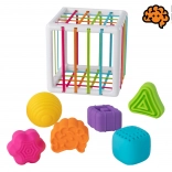 InnyBin gitterförmige Steckbox. Der Rahmen des Würfels besteht aus Kunststoff. Das Gitter wird von elastischen Schnüren gebildet. Unterschiedlich geformte Bausteine aus weichem Material lassen sich leicht durch das Gitter hindurchschieben.