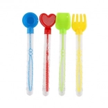 Vier verschiedene Griffarten: Kreis, Herz, Quadrat und Gabel, in den Farben Blau, Rot, Grün und Gelb.