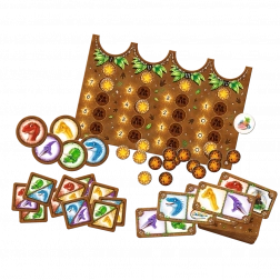 In der Schachtel findet ihr einen beidseitigen Spielplan, 60 Dinosaurierkarten, Startkarten, Marker für die Grund- und Fortgeschrittenenvariante, Lava-Marker, einen Leckereien-Marker und eine übersichtliche Anleitung.