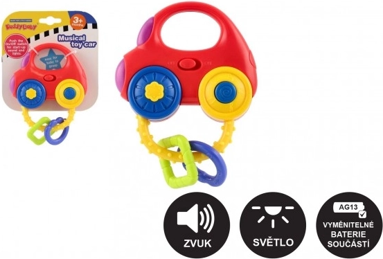 Das farbenfrohe Auto-Rasselspielzeug bietet Spaß und fördert zugleich Hör-, Seh- und Feinmotorik. Einfach schütteln oder die Tasten drücken, und das Spielzeug lässt Lichter aufleuchten, spielt Melodien und realistische Geräusche von Start, Fahrt und Hupen. Die kompakten Abmessungen von 10 × 11 cm und die abgerundeten Formen erleichtern das Greifen auch für die Kleinsten.
