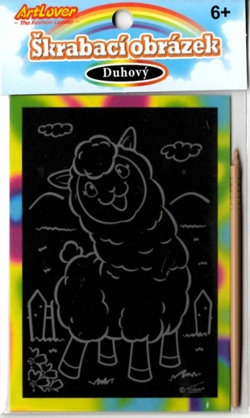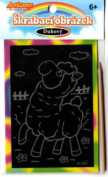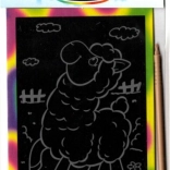 Das Bild enthält eine untere bunte Schicht und einen Plastik-Kratzstift, der die Arbeit damit auch für kleinere Kinder sicher macht.
