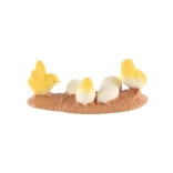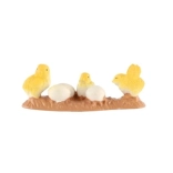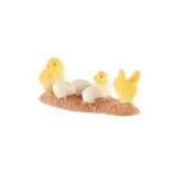 Die Dekoration umfasst drei gelbe Küken und mehrere weiße Eier auf einem braunen Sockel, was Ihrem Zuhause eine fröhliche Atmosphäre verleiht.