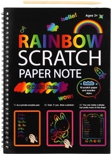 Dieser Kratzblock mit Regenbogenhintergrund bietet eine einfache, aber faszinierende Möglichkeit, einzigartige Bilder zu gestalten. Auf der schwarzen Oberfläche genügt sanftes Kratzen und sofort erscheinen leuchtende Regenbogenfarben. Hervorragend für kleine Künstler und als entspannende Beschäftigung für ältere Kinder.