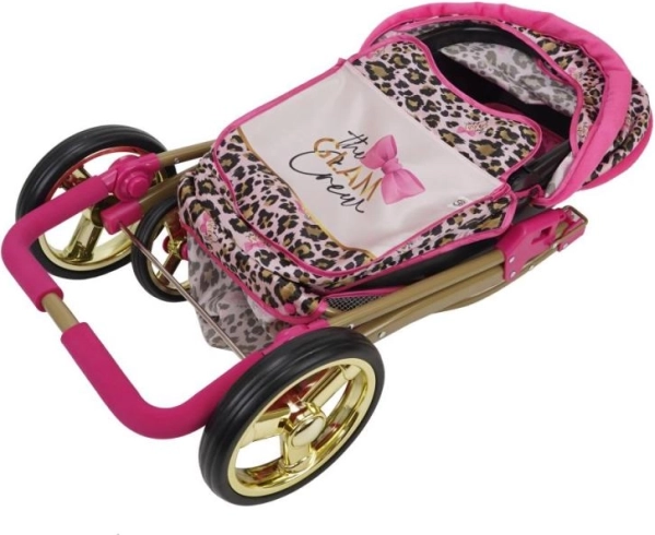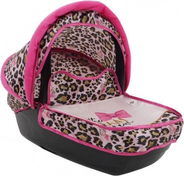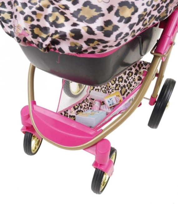 Luxuriöses Aussehen mit Leopardenmuster und rosa und goldenen Akzenten verleiht dem Kinderwagen einen einzigartigen Charakter.