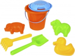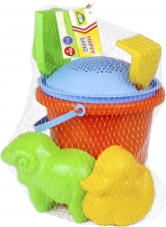 Im Set ist alles Nötige enthalten: ein Eimer mit 18 cm Durchmesser (2 l), Sieb, Schaufel, Rechen und 3 Förmchen. Alles ist so gestaltet, dass es Kinderhänden gut liegt und leicht zu verwenden ist – geeignet auch für die Kleinsten ab 1 Jahr.