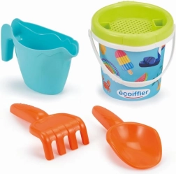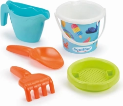 Kinder Eimer mit Sommermotiv und praktischem Zubehör für Sand: Gießkanne, Sieb, Harke und Schaufel.