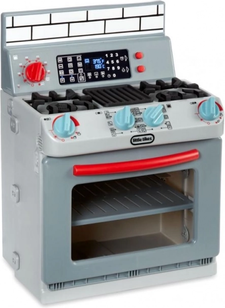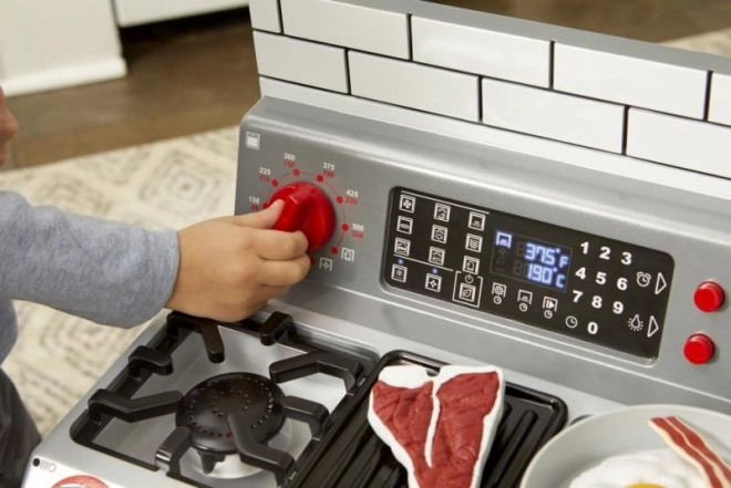 Drehknöpfe und ein übersichtliches Bedienfeld mit Anzeigen machen das Kochen zu einem realistischen Vergnügen. Kinder können die Temperatur einstellen und die Ofentür öffnen – alles sicher und einfach.