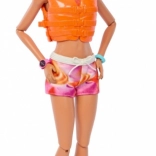 Barbie trägt ein modernes Schwimmoutfit, ein Stirnband und Sonnenbrillen, die ihr einen stylischen Look für jeden sonnigen Tag am Strand verleihen.
