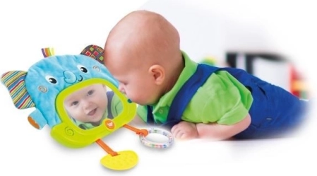 Der interaktive WINFUN-Elefant ist der ideale Begleiter fürs Bettchen und für die Spieldecke. Dank der flexiblen Befestigung lässt er sich leicht am Gitter des Bettchens anbringen oder mithilfe des klappbaren Ständers aufstellen. Kleine Händchen begeistert das sichere Spiegelchen mit sanfter Hinterleuchtung, in dem Tierbilder erscheinen, sowie die vielfältigen Materialstrukturen – weich, glatt und strukturiert.