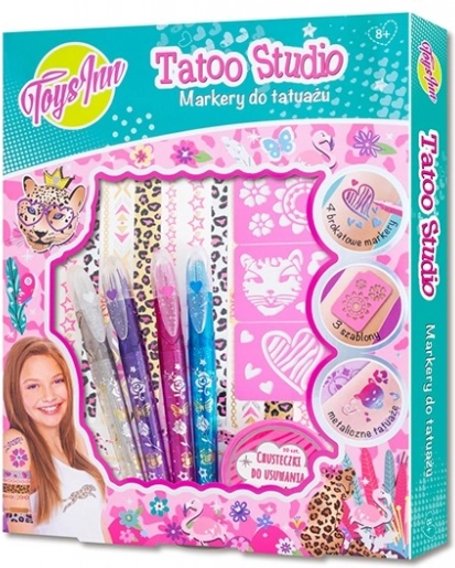 Das Set der Tattoo-Stifte enthält: 4 glitzernde Tattoo-Stifte, 3 Schablonen, 1 Bogen Metallic-Tattoos, 30 Tücher zum Entfernen der Tattoos.