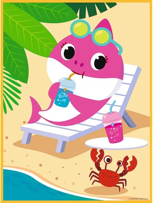 Das Puzzle bietet zwei verschiedene Szenen aus der farbenfrohen Welt der Haie am Strand und unter Wasser.
