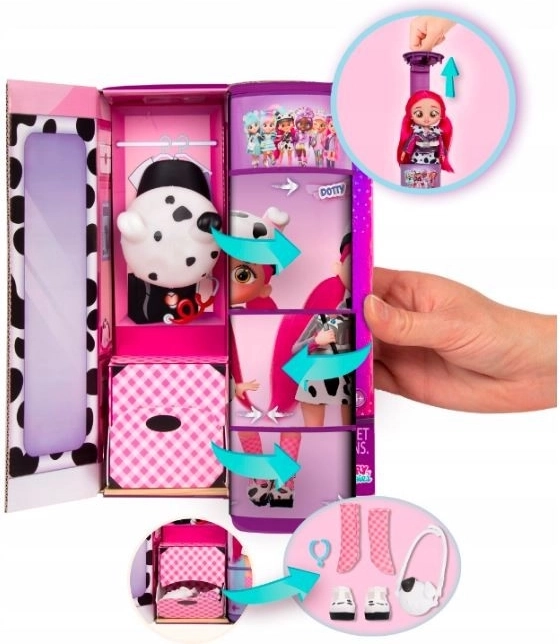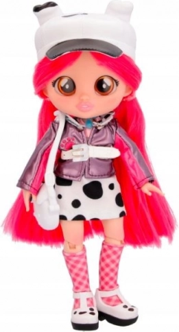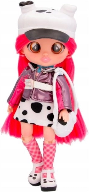 Dotty hat stylische, farbige Haare, kristallklare Augen und einen beweglichen Körper! Sie trägt ein modisches Outfit und ein besonderes gepunktetes Kleid mit Halskette, eine metallische Lederjacke, Plateauschuhe im Mary-Jane-Stil und karierte Socken! Ergänze sie mit einer Umhängetasche, einer niedlichen Mütze mit Hundsohren und der passenden BFF-Halskette!