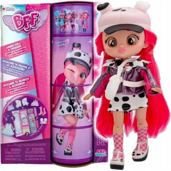 Lerne die neuen besten Freundinnen, die BFFs, kennen! Deine Lieblingsfiguren aus dem Film Cry Babies Magische Tränen sind jetzt älter geworden und Teenager! Sie sind 13 Jahre alt und es warten viele Abenteuer auf sie. In der Kollektion gibt es 6 Puppen zum Sammeln, jede trägt moderne Outfits nach dem neuesten Modetrend. Sie sind 15 cm groß, haben bunte Haare, kristallklare Augen und voll bewegliche Körper. Welche beste Freundin wählst du? Dreh die Röhre und finde es heraus! Packe aus und entdecke ihre Garderobe mit mehr als 9 Überraschungen: 2 Kleidungsstücke, eine Tasche, einen Haarreif oder Stirnband, ein Paar passende Schuhe mit Socken und eine Halskette! Die BFF-Puppen haben seidiges Nylonhaar und richtig modische Kleidung! Jede Puppe ist in einer einzigartigen Box verpackt, die zugleich ihr Kleiderschrank ist! Durch Drehen der Röhrensegmente entdeckst du verschiedene Posen, die deine beste Freundin einnehmen kann!