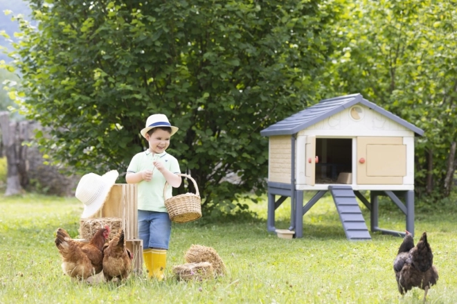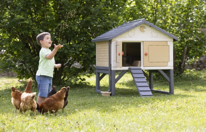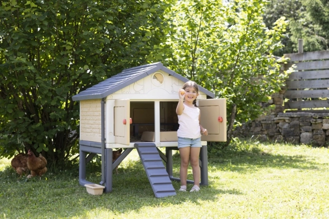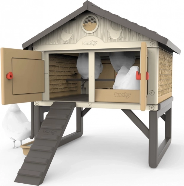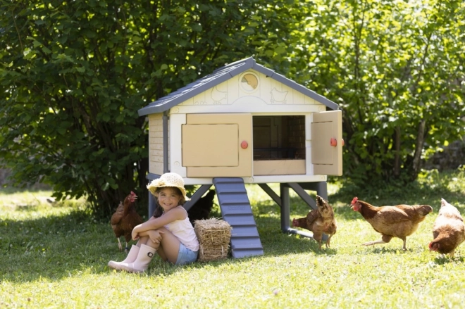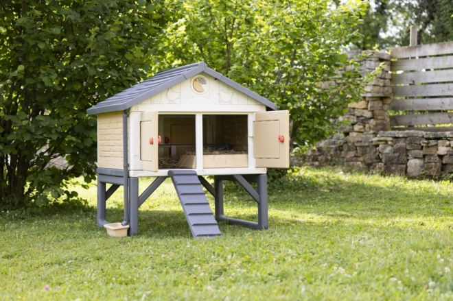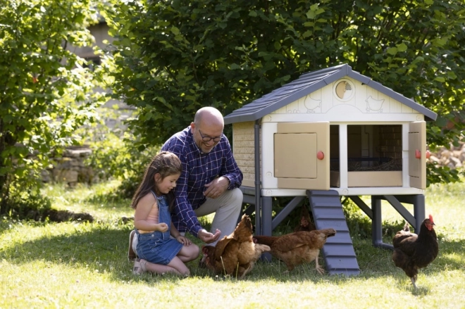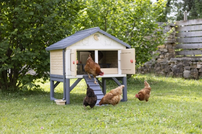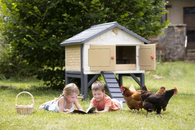 Ein echter Hühnerstall für 3 bis 5 Hennen. Ein aus Kunststoff gefertigter, leicht zu reinigender und geräumiger Stall für die Hühnerfamilie. Die Hühner gelangen über eine Leiter in den Stall. Im Sitzbereich befindet sich auch ein Nistkasten. Der Stall ist mit 4 großen Türen ausgestattet, die nachts geschlossen werden können. Die spezielle Dachkonstruktion und die Regenrinnen ermöglichen das Auffangen von Regenwasser, das in einem Behälter gesammelt und zum Tränken der Hühner verwendet werden kann. Das Belüftungssystem ermöglicht es, die Zufuhr von Frischluft auch bei geschlossenen Türen zu verringern oder zu erhöhen. Zum Set gehört eine Broschüre für Kinder: Wie man Hühner hält + ein Attrappen-Ei.