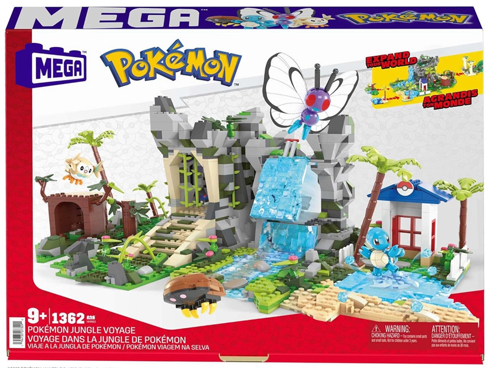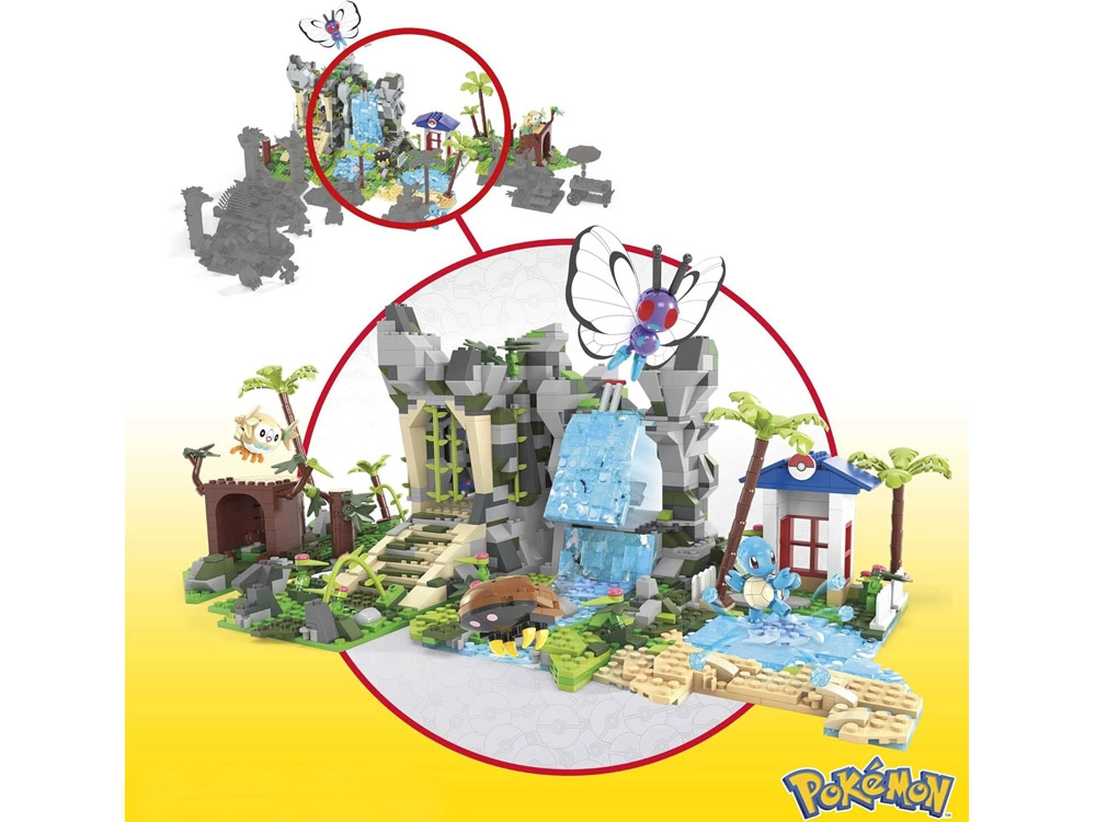 Die vier modularen Bereiche können nach Belieben umgebaut und verbunden werden: Höhle im Regenwald, Berg mit Wasserfall, Eingang zu antiken Ruinen und See mit Strand und Palmen. Außerdem enthalten sind vier ikonische, baubare Pokémon-Figuren: Butterfree, Schiggy, Kabuto und Bauz.