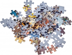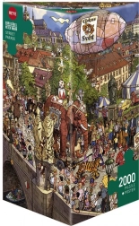Kreatives Puzzle in einer außergewöhnlichen dreieckigen Schachtel, das Groß und Klein großartigen Spaß bereitet. Das Motiv des deutschen Künstlerduos Doro Göbel und Peter Knorr zeigt eine lebendige und humorvolle Umzugsszene.
