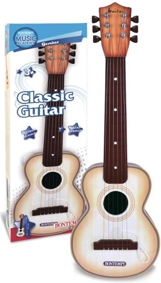 Klassische Bontempi-Gitarre mit 6 Stahlsaiten, Länge 55 cm. Beim Spielen erzeugt sie realistische Klänge. Sie ist eine hervorragende Wahl für Kinder, die Interesse an Musik zeigen und ihre ersten Fähigkeiten entwickeln möchten.