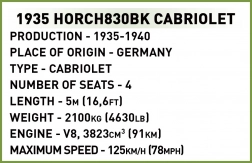 Dieser realistische Bausatz stellt eine verkürzte Version des legendären Fahrzeugs HORCH 830BK dar, bekannt für seine Qualität und technischen Innovationen. Speziell entwickelte Elemente für Fahrzeugmodelle gewährleisten stimmige Proportionen und zahlreiche überraschende Details. Dauerhafte Drucke anstelle von Aufklebern verleihen dem Modell eine hochwertige Optik und Widerstandsfähigkeit beim Spielen.