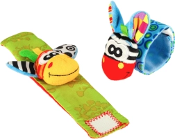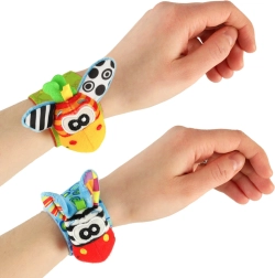 Die niedlichen Tierchen-Bänder begeistern Babys mit kontrastreichen Farben und Mustern, weichem Stoff und verschiedenen Haptik-Texturen. Jede Handbewegung wird mit einem sanften Rasselgeräusch belohnt; in den Ohren steckt zusätzlich knisternde Folie für weitere Sinneseindrücke.